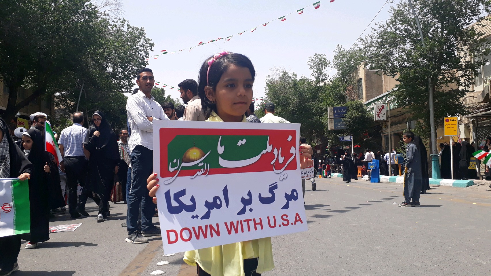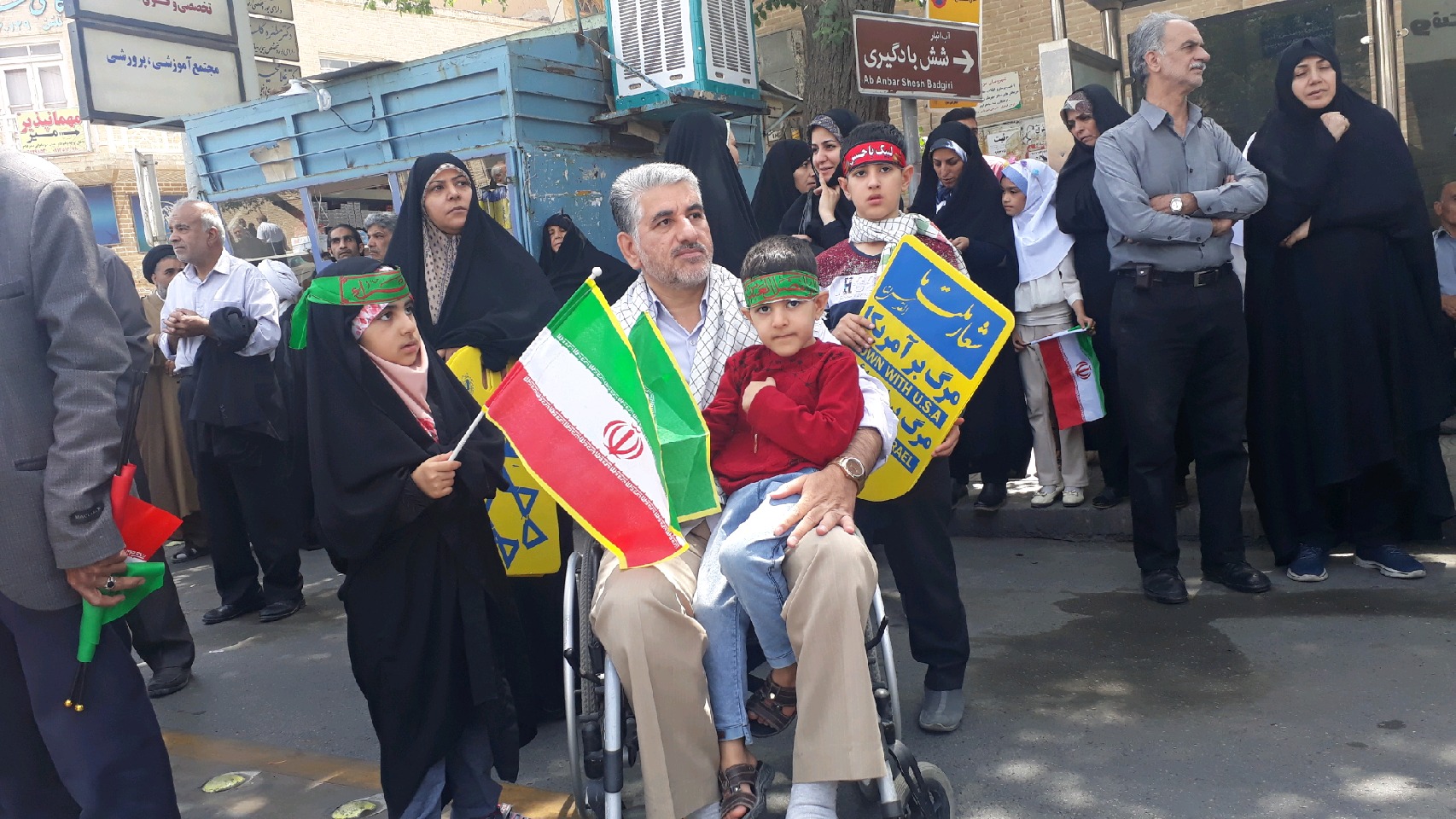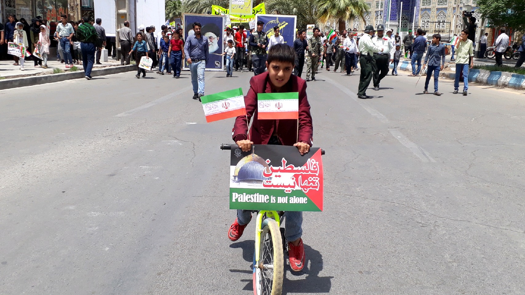 کودکان یزدی ، با درست کردن آدمک های ایادی استکبار و تزئین دوچرخه و کالسکه های خود با پرچم فلسطین از کودکان مظلوم فلسطینی حمایت کردند.