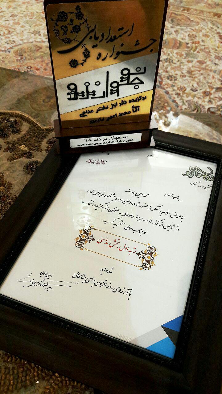 به گزارش خبرگزاری صدا و سیما ، مرکز اصفهان ؛ رییس اداره تبلیغات اسلامی شهرستان آران وبیدگل گفت:در این جشنواره که ویژه دختران و پسران ۱۲ تا ۱۹ سال در رشته های مداحی عکاسی، خوانندگی، مجری گری، بازیگری برگزار شد، محمدامین یارمند پس از گذر از سه مرحله داوری موفق به کسب رتبه نخست شد.