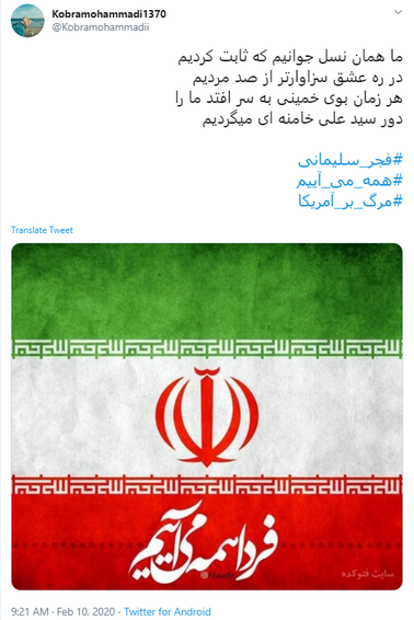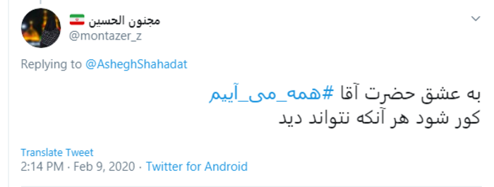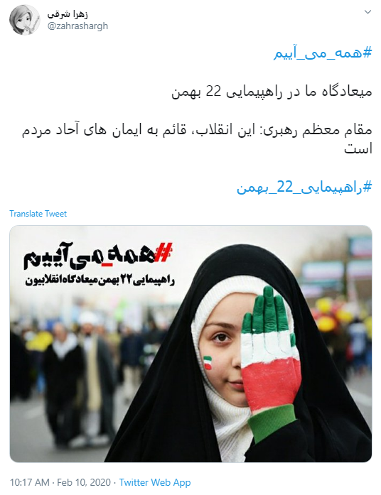 به گزارش گروه فضای مجازی خبرگزاری صدا و سیما، کاربران با داغ کردن هشتگ‌های #همه_می_آییم و #راهپیمانی_۲۲_بهمن اعلام کردند که بار دیگر در صحنه حاضر خواهند شد و راهپیمایی پرشکوهی را رقم خواهند زد؛ آن‌ها همچنین به جای خالی سردار دل‌ها سپهبد شهید حاج قاسم سلیمانی اشاره کردند.