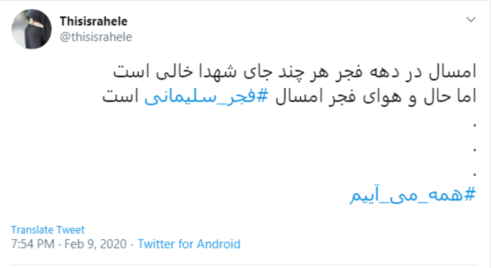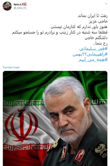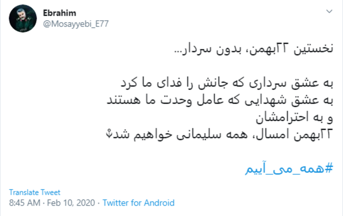 بسیاری از کاربران فضای مجازی دلنوشته‌هایی درباره حضورشان در راهپیمایی امروز بدون حضور سردار سپهبد شهید حاج قاسم سلیمانی منتشر کرده‌اند.